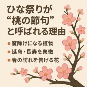「桃の節句」と呼ばれるのは、ちょうど桃の花が咲く季節であり、桃が邪気を払う力があるとされていたためです。